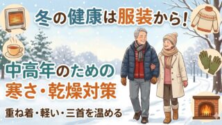 中高齢者の季節行事 冬の服装|重ね着・防寒・外出時の注意 冬の寒さや気温差に対応するための重ね着、防寒アイテム、室内着の選び方を中高年向けに解説。暖かく快適に過ごすための冬の服装ポイントを分かりやすくまとめました。 2026.04.18 中高齢者の季節行事冬冬の服装